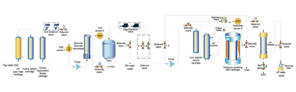 超純水 (UPW) 通常被認為是在 25ºC 時電阻率大于18MΩ.cm或接近18.3MΩ.cm水,水中的導電介質幾乎完全去除,又把水中不離解的膠體物質、氣體及有機物均去除至很低程度的水?,F(xiàn)在的超純水制備采用了預處理、電滲析(EDI)紫外線殺菌、反滲透(RO)、離子交換及各種膜過濾技術等。